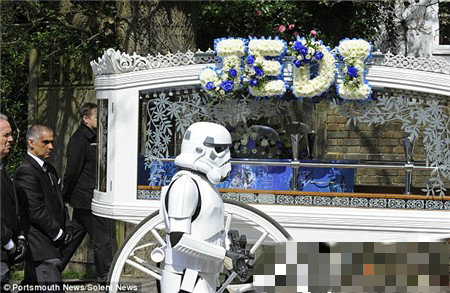 His carriage was covered floral tributes, including one reading 'Jedi' andwreaths in the shape of a light saber, Yoda and R2-D2.