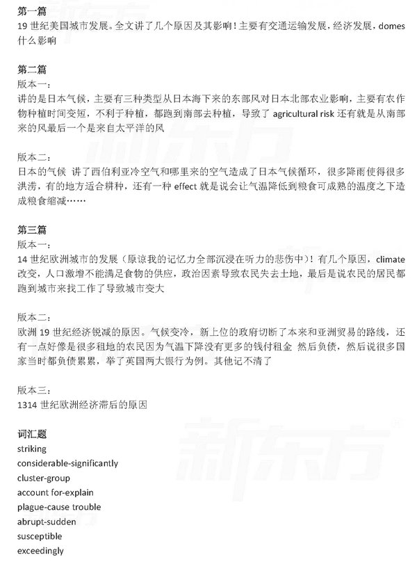 阅读第三篇讲的是14世纪欧洲城市的发展。有几个原因:climate改变,人口激增不能吗,满足食物的供应,政治因素导致农民失去土地,最后是说农村的居民都跑到城市来工作导致城市变大。