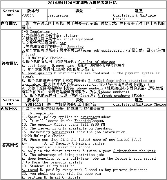 2014年4月26日雅思考试笔试已经结束,小编为大家带来史上最全面的雅思考试回忆。总体来讲,本次听力考题比较简单,4篇全部都是都是考过的内容,大家在往届的机经中可以进行参考。但往届机经给出的答案有出错的地方,考生还需注意。