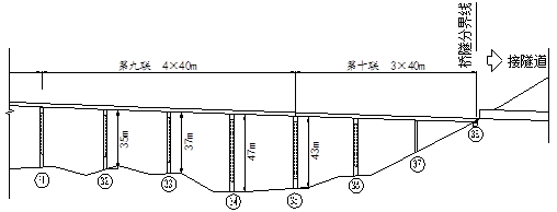 某10联现浇预应力混凝土连续箱梁桥地处山岭重丘区,跨越河谷,起点与另一特大桥相连,终点与一隧道相连。部分桥跨布置示意图如图4-1所示。