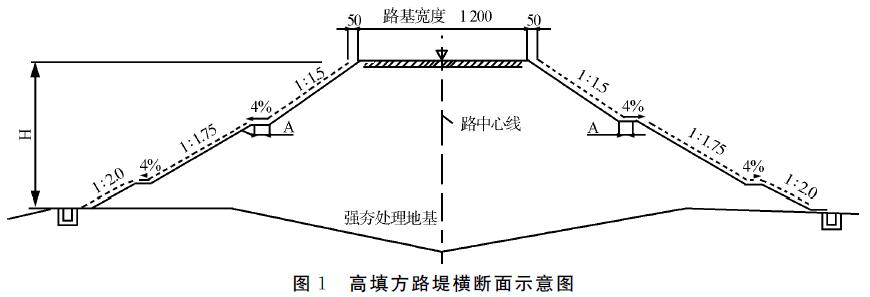 某施工单位承建了一段二级公路路基工程,其中K3+220~K3+650为高填方路堤。路基填方高度最高为21.2m,地面以下有约6m的软土层。施工单位采用强夯处理地基,采用水平分层填筑路堤。高填方路堤横断面示意图如图1所示。