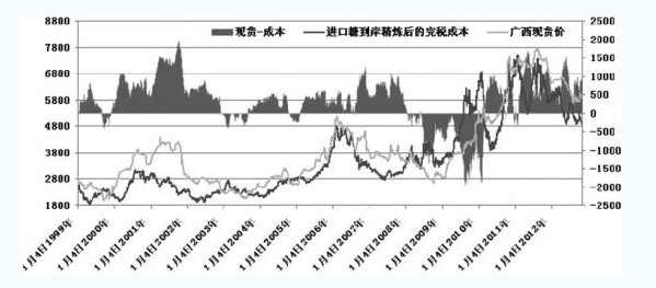 甘蔗生长周期为增产2―3年、减产2―3年,参照2006―2008年榨季的增产周期,目前处于增产周期的第二年。2007年全年白糖走势较为平稳,今年在收储政策和基本面对立下,糖市可能会重现2007年走势,这主要有两方面的原因:
