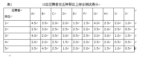 某企业根据生产经营需要,决定招聘1、2、3、4、5五种职位所需要的人员,如果假设岗位1、岗位2、岗位3、岗位4、岗位5所需的最低测试分数分别3.5,2.5,2.5,3.0,3.5,要从这10个人中选出5人来担当不同的岗位,其综合测试得分如表1: