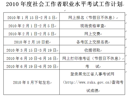 报名时间:2010年1月15日-2月5日(节假日可报名)。报名考生登录黑龙江省人事考试网(http://www.rsks.gov.cn)的“网上报名”栏目,按照社会工作者考试网上报名系统规定的程序和要求,填写个人信息,上传照片,从网上直接打印报名表(报名表用A4纸打印,供现场资格审查时使用)。