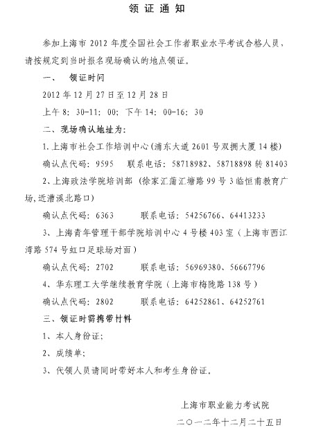 上海2012年社会工作者职业水平考试合格证书领取