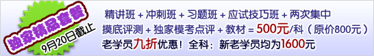精讲班主要是根据考试教材和大纲对各章节的具体内容和题例进行详细的精讲,同时按章节提供专门的课后作业供学员进行练习,以达到全面掌握,巩固基础知识,深层的了解考试的重点和难点,最后配有一套全真模拟测试题供学员检测学习效果。