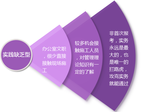 实务和经济,往往是这类学员最难学的科目。备考中至少要有50%的精力用于实务的复习,25%的精力放在经济上。管理和法规,只要跟上老师的讲课即可。