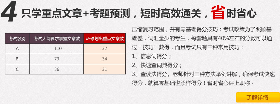 考试题型 卷面顺序 卷面分值 答题时间 稳拿分数 拿分技巧 词汇选项 第1~15题 15分 20分钟 13~14 幺建华老师词典+速查技巧专为职称英语考试设计 阅读判断 第16~22题 7分 12分钟 4~6 环球独创“查读法” 概括大意与完成句子 第23~30题 8分 20分钟 4~6 “选择排除法” 阅读理解 第31~45题 45分 40分钟 30~33 “关键字法”、“概率法”等方法一起使用 补全短文 第46~50题 10分 20分钟 3~6 “排序法”、“配对法” 完形填空 第51~65题 15分 8分钟 11~13 教材文章精读+文章点题 六种题型总计 65题 100分 120分钟 轻取65~75分 - -