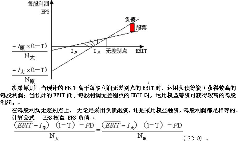 (1)每股收益无差别点法的含义: :指每股利润不受融资方式影响的息税前利润水平。根据每股收益无差别点法,可以分析判断在什么样的息税前利润水平下适于采用何种资本结构。