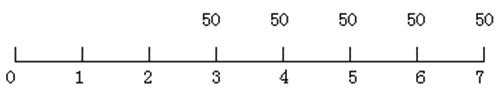 承上例,如果前2年也有年金发生,那么就是7期普通年金,视同从第1年年末到第7年年末都有年金发生,7期普通年金总现值是50×(P/A,i,7)-50×(P/A,i,2)=50×[(P/A,i,7)-(P/A,i,2)]。