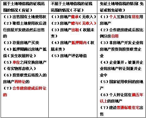 上述内容的具体化经常在考试中出现,具体问题可归纳为应征、不征、免征三个方面。下面将经常出现的房地产若干具体情况的征免问题汇总归纳如下:
