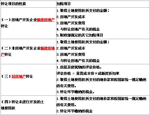计算土地增值额时准予从转让收入中扣除的项目,根据转让项目的性质不同,可进行以下划分: