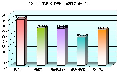 通过对网校学员的电话回访,统计出网校2011年度注册税务师考试辅导通过率情况为:税法一92.89%、税法二89.55%、税务代理实务89.34%、税收相关法律85.92%、财务与会计88.87%。