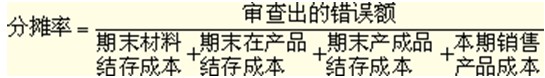 计算分摊的方法是,应按产品成本核算过程逐步剔除挤占因素,即将审查出的需分配的错误金额,按材料、自制半成品、在产品、产成品、产品销售成本等核算环节的程序,一步一步地往下分配。将计算出的各环节应分摊的成本数额,分别调整有关账户,在期末结账后,当期销售产品应分摊的错误数额应直接调整利润数。在实际工作中一般较多地采用“按比例分摊法”。分摊率的计算公式如下: