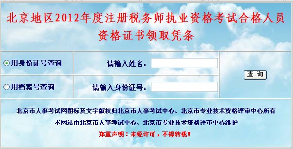北京地区2012年度注册税务师执业资格考试合格人员资格证书领取凭条开始查询,考生可以通过下面链接进入页面。