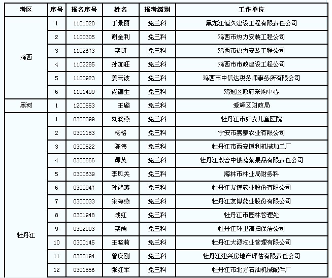 摘要 鸡西、黑河、牡丹江2013年注册税务师考试免试复核通过人员名单