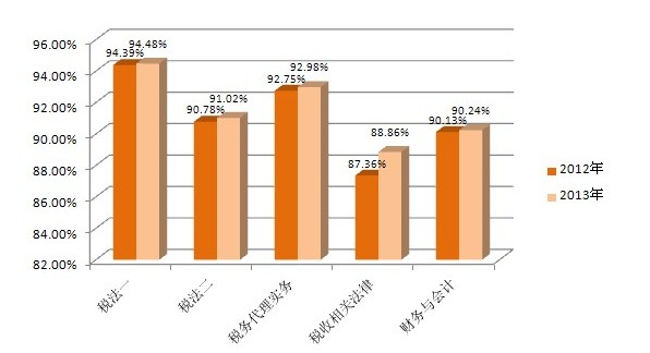 通过对网校学员的电话回访,统计出网校2013年度注册税务师考试辅导通过率情况为:税法一94.48%、税法二91.02%、税务代理实务92.98%、税收相关法律88.86%、财务与会计90.24%。