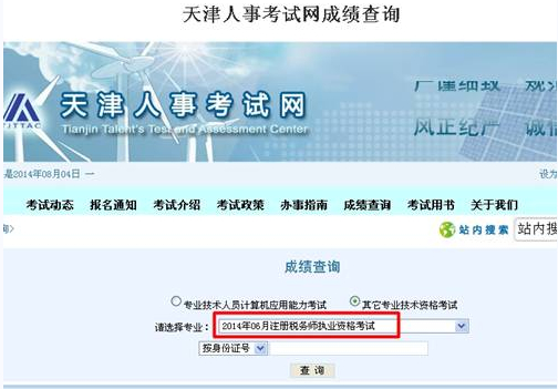 具体查询方式:登录“天津人事考试网”→点击“成绩查询”→其他专业技术资格考试→2014年06月注册税务师执业资格考试。