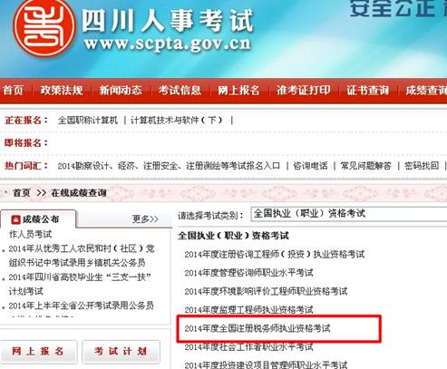 查询方式:登录“四川人事考试网”→点击“成绩查询”→点击进入成绩查询→=有考试类别=(全国(执业)职业资格考试)→2014年度全国注册税务师执业资格考试。
