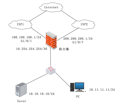 某企业网络拓扑如图2-1所示,该企业通过两个不同的运营商(ISP1和ISP2)接入Internet,内网用户通过NAT访问Internet。公网用户可通过不同的ISP访问企业内部的应用。