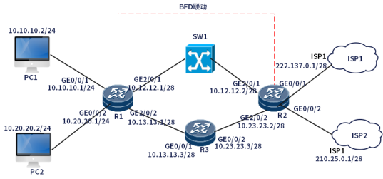 路由器R2为接入网关,为用户提供双链路接入,通过静态IP接入运营商,要求在R2上行接口配置NAT,使内网访间Internet。