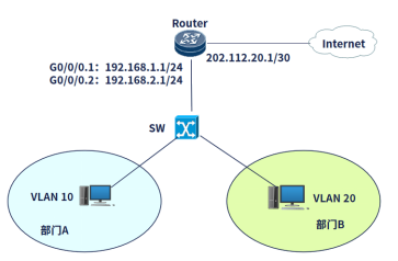 某公司网络拓扑如图所示,有A和B两个部门,分别使用C类地址192.168.1.0/24和192.168.2.0/24,其中部门A为固定办公区域,部门B为移动办公区域。两个部门均有访问互联网的需求。