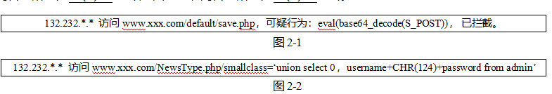 年初, 网络管理员检测到部分境外组织借新冠疫情对我国信息系统频繁发起攻击, 其中, 图 2-1 访 问日志所示为 (3) 攻击 , 图 2-2 访问日志所示为 (4) 攻击。