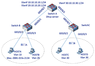 根据业务要求,在部门A中,新加入的MAC地址为0081-01fa-2134,主机HOST A需要加入VLAN 10并获取相应IP地址配置,连接在交换机Switch B的GE0/0/3接口上的主机需加入VLAN 20并获取相应IP地址配置。部门B中的所有主机应加入VLAN 30并获取相应IP地址配置。