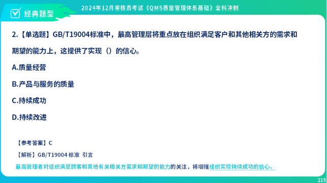 GB/T 19004标准中,最高管理层将重点放在组织满足客户和其他相关方的需求和期望的能力上,这提供了实现组织( )的信心。