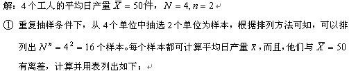 例2 假设从4个生产零件的工人总体抽取2人进行抽样调查,来推断4个工人的平均日产量。4个工人的实际日产量分别为A:40件,B:45件,C:55件,D:60件。求重复抽样条件下和不重复抽样条件下的抽样误差。