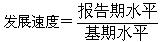 发展速度是以相对数形式表示的两个不同时期发展水平的比值,表明报告期水平已发展到基期水平的几分之几或若干倍。计算公式为:转自环 球 网 校edu24ol.com
