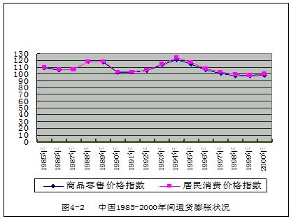 由数据可见,1985-2000年间,中国物价指数的变化以1998年为界可以分为两个阶段。此前物价指数为正,说明一直存在不同程度的通货膨胀;此后物价水平下降,说明处于通货紧缩状态。在1985-1988年间,有两个通货膨胀的高峰期,即1988-1989年和1993-1995年,其幅度在一定程度上已具备了上述飞奔的通货膨胀的特征。