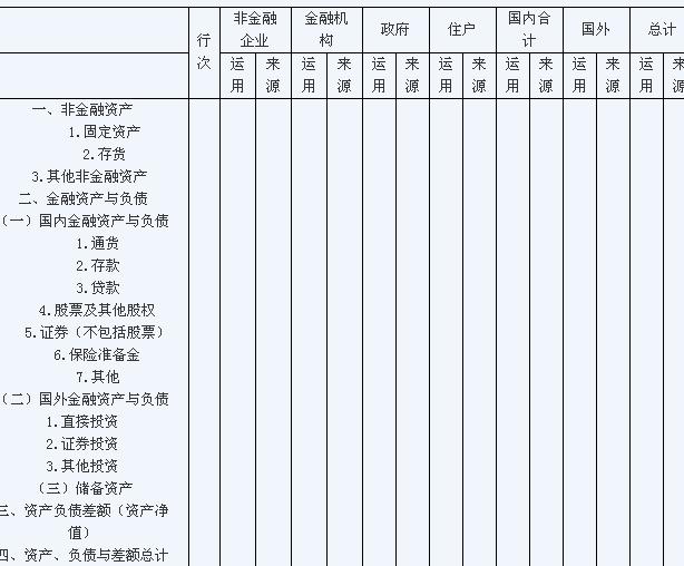 横行按资产负债各项目列示,包括非金融资产、金融资产与负债、资产负债差额。
