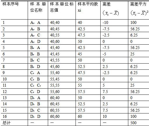 例2:假设从4个生产零件的工人总体抽取2人进行抽样调查,来推断4个工人的平均日产量。4个工人的实际日产量分别为A:40件,B:45件,C:55件,D:60件。求重复抽样条件下和不重复抽样条件下的抽样误差。