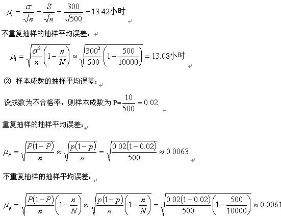 例4:某企业生产一批灯泡,共10000只,随机抽取500只,作耐用实验。测算结果平均使用寿命为5000小时,样本标准差为300小时,500只中发现10只不合格,求样本平均数和样本成数的抽样平均误差。
