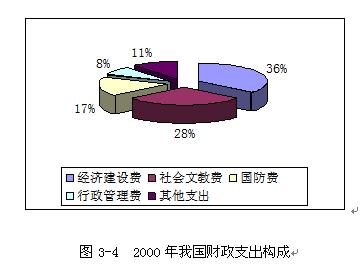 上述两图说明了我国2000年财政收入和支出的构成情况。由图3-3可见,税收收入是我国财政收入的最主要来源,占到了94%,预算基金收入和其他收入只占6%;在按照职能分组的财政支出构成中,经济建设费比重最高(36%),社会文教费和行政管理费,随后,这三方面占据了财政支出的五分之四强。