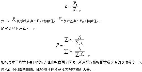 平均指标指数是两个不同时期或不同空间的平均指标之比。这里的平均指标不仅包括前面定义的平均指标,也包括形式上与平均指标相似的相对指标。平均指标指数的一般公式: