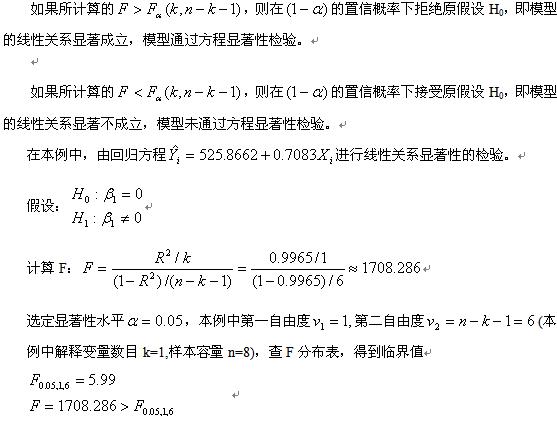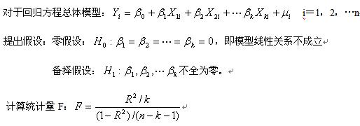 检验回归方程的显著性应用假设检验的方法。对回归方程线性关系显著性的检验采用F检验。检验依据样本估计的回归方程所体现的被解释变量与解释变量之间的线性关系在总体上是否显著成立,即是检验总体的参数是否显著不为0。