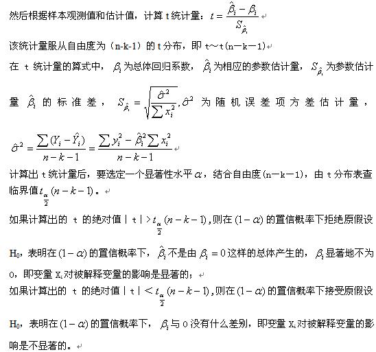 变量显著性检验即对回归系数的显著性进行检验,如果变量Xi是显著的,那么回归系数 应该显著地不为0。于是,在变量显著性检验中设计的原假设为: