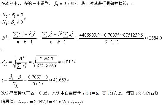 拒绝原假设H0,接受备择假设H1。表明在95%置信概率下, 不是由 这样的总体产生的, 显著地不为0,即变量Xi对被解释变量的影响是显著的。也就是说,在95%的置信概率下,城镇居民的人均可支配收入对于人均消费性支出的影响是显著的。