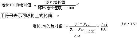 速度指标的数值与基数的大小有密切关系。环比增长速度时间数列中,各期的基数不同。因此运用这一指标反映现象增长的快慢时,往往要结合水平指标的分析才能得出正确结论。“增长1%的绝对值”是进行这一分析的指标。它反映同样的增长速度在不同时间条件下所包含的绝对水平。计算公式为: