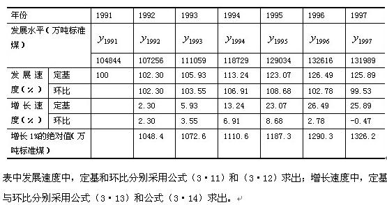 例9 我国1991-1997年能源生产量列于表3-12,根据这些资料计算的发展速度、增长速度及增长1%的绝对值也列于该表中。