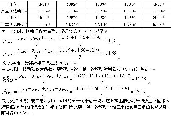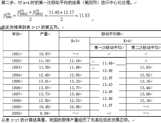 例13:下表是1991-2000年我国的原煤产量数据,计算移动项数k=3,k=4时的反映趋势变动的新数列。