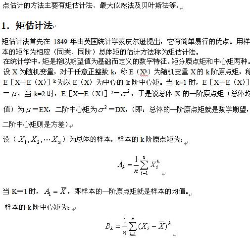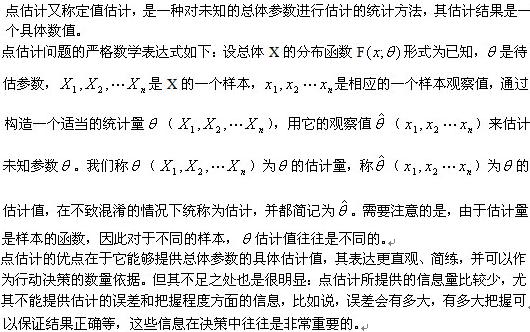 参数估计是本章讨论的问题。参数估计可表述为:在总体的分布函数或概率函数的数学表达式已知的情况下,通过对样本的实际观察取得样本数据,并在此基础上通过对样本统计量的计算得到总体待估参数的估计值来代替其真实的过程。参数估计包括点估计和区间估计。