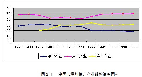 图2-1展示了依据增加值占国内生产总值的比例计算的中国产业结构。由图可以看到,1978年以来,中国产业结构变动并不显著。尽管20世纪80年代第二产业的比重曾经有所下降,但它一直是中国最大的产业。1985年,第三产业首次赶上并超过第一产业,随后第一产业比重不断下降,目前比重不足20%。但中国第三产业在超过第一产业之后并未持续上升,而是停滞不前,如何加快第三产业的发展,仍然是中国产业结构演进中的一个重大课题。