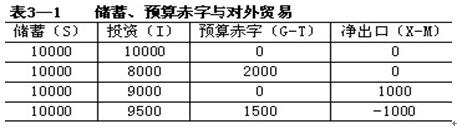 表3—1共有四行数据,代表了四种不同的经济形势。从第一行可以看出,假定储蓄为10000亿元,投资也为10000亿元,政府预算和对外贸易必须同时实现平衡,宏观经济运行才能实现均衡。第二行表明,如果储蓄仍为10000亿元,但在政府预算出现2000亿元赤字的情况下,企业部门必须减少2000亿元的投资,即总投资为8000亿元时,宏观经济才能实现均衡。在第三行,对外贸易出现了1000亿元的顺差,这意味着外国部门对国内的产品具有强劲的需求,为实现宏观经济均衡,这时企业部门只能把投资减少到9000亿元。最后一行告诉我们,如果储蓄还是10000亿元,但投资为9500亿元,政府赤字为1500亿元,为满足国内的强劲需求,实现宏观经济的均衡,就必须增加进口,以致出现了1000亿元的外贸逆差,这是实现宏观经济均衡必不可少的。