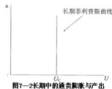 在图7—2的坐标中,纵轴表示通货膨胀率,横轴表示失业率,坐标中垂直于横轴的垂线被称为长期菲利普斯曲线。垂直的长期菲利普斯曲线表明,在长期中,无论价格水平怎样变动,失业率均为自然失业率()不变,如第三章和第五章所述,在只存在自然失业率的条件下即实现了充分就业的条件下所实现的产出水平实际上就是潜在的产出水平。因此,图7—2中的垂线不仅意味着自然失业率或充分就业的就业率与价格水平无关,也意味着潜在产出水平与价格水平无关。在长期中,潜在产出与价格水平之所以无关,是因为潜在产出水平取决于生产要素的投入数量和生产要素的效率,而不是取决于价格水平。