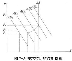 总需求的增加是否会导致通货膨胀,与总供给的状况有关。在一个经济社会没有实现充分就业即资源没有被充分利用之前,或者说供给弹性很大时,总需求的增加只能导致产出的增长而不会引起通货膨胀。当经济扩张到一定阶段,以致某些资源的供给变得相对不足时,总需求的进一步增加虽然还会刺激经济的进一步增长,但也会引发价格水平的小幅上升,从而出现英国经济学家凯恩斯所说的“半通货膨胀”或“爬行式通货膨胀”。当经济中的资源已经被充分利用即实现了充分就业以后,总需求的继续增加就会导致真正意义上的通货膨胀或完全的通货膨胀。这时,产出不再增加或增加很少,但价格水平则会急剧上升,这就是需求拉动的通货膨胀。需求拉动的通货膨胀可以见课本图7—3来。