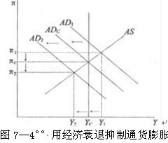 这是一项反需求拉动通货膨胀的经济政策。由于需求拉动通货膨胀的起因是过度需求,因此,只要抑制总需求,就可以达到抑制通货膨胀的目的。在政策上,政府可以通过实行紧缩性的财政政策和紧缩性的货币政策来实现。实行紧缩性的财政政策意味着要减少政府支出或增加税收,实行紧缩性的货币政策意味着应当抽紧银根,减少货币供给量,提高利率。实行紧缩性的财政政策和紧缩性的货币政策,会导致消费需求、投资需求、政府需求和来自国外的需求即净出口的减少,从而导致总需求的减少。在总供给水平不变的情况下,总需求的减少会导致价格水平的降低,从而对通货膨胀起到抑制作用。但这也会导致产出水平的下降,从而引起经济衰退。如图7—4所示。