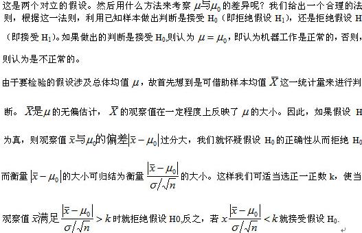 统计推断是一方面通过构造统计量,运用样本信息,实施对总体参数的估计。另一方面是从统计量出发,对总体某些特性的假设作出拒绝或接受的判断,这也就是假设检验所要讨论的中心问题。这一思想相当于数学中的“反证法”。
